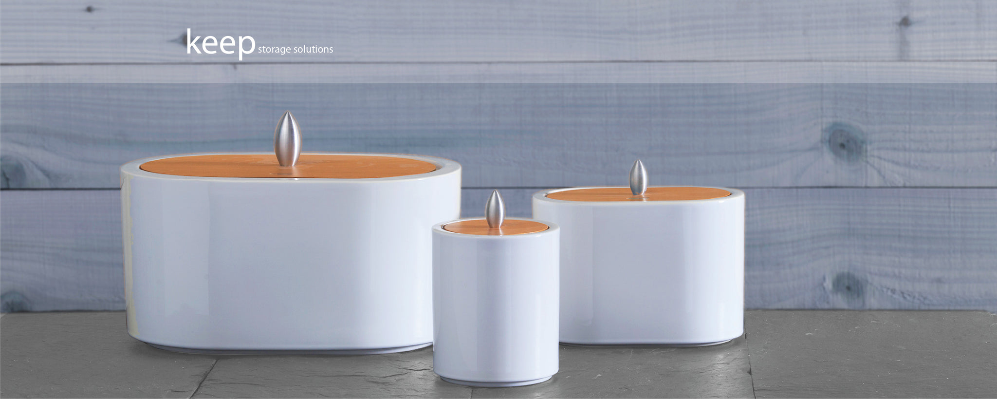 As the title implies, "Keep" comprises a collection of containers that are designed to keep their contents in prime condition. "Keep" containers are ceramic and feature beech wood lids and distinctive metal knobs. The range currently includes a Bread Bin, Store Jars, and Treats Jars. Store Jars are fitted with an easy-to-open airtight sealed lid. Our Bread Bin is capacious, holding several units of bread while our Treats Jar is designed to store packaged snacks and treats.